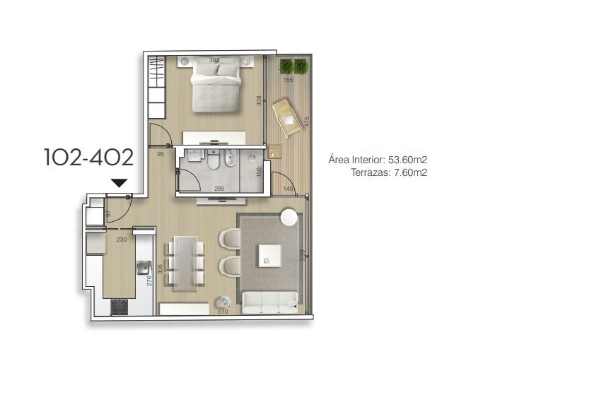 102 | 1 DORM | 53,6 | 7,6 | 61,2 | 159.430 |