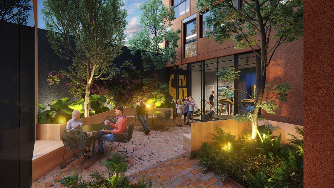 • Un hall de acceso flex que integra a los locales comerciales con salas de reunión, gimnasio y patio interno.
