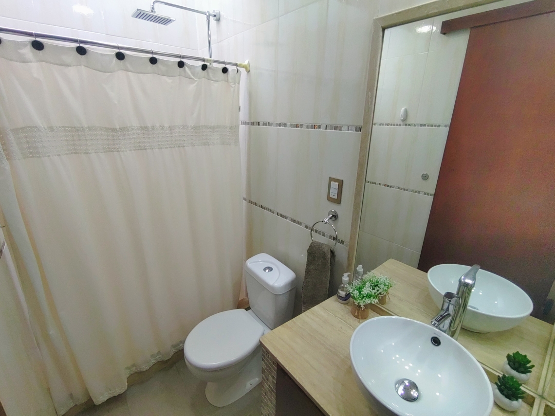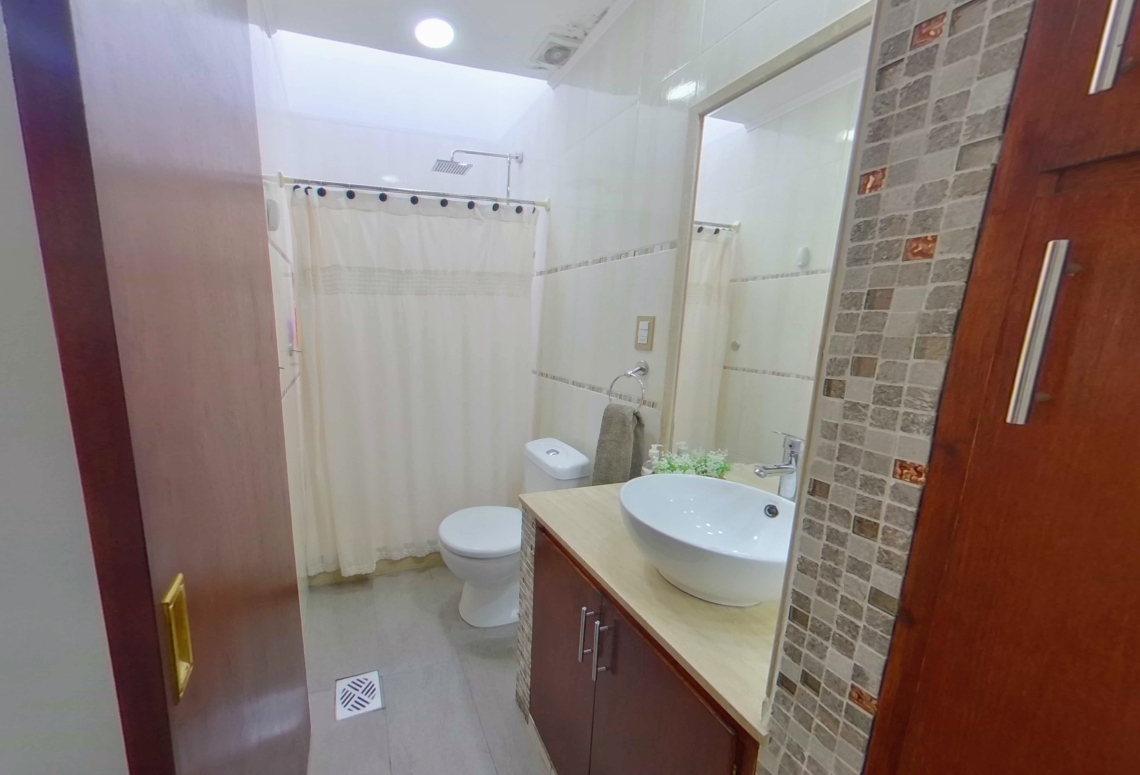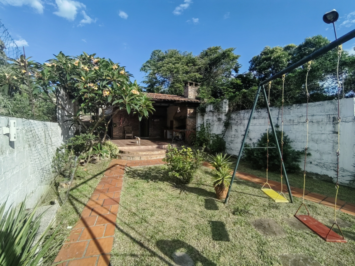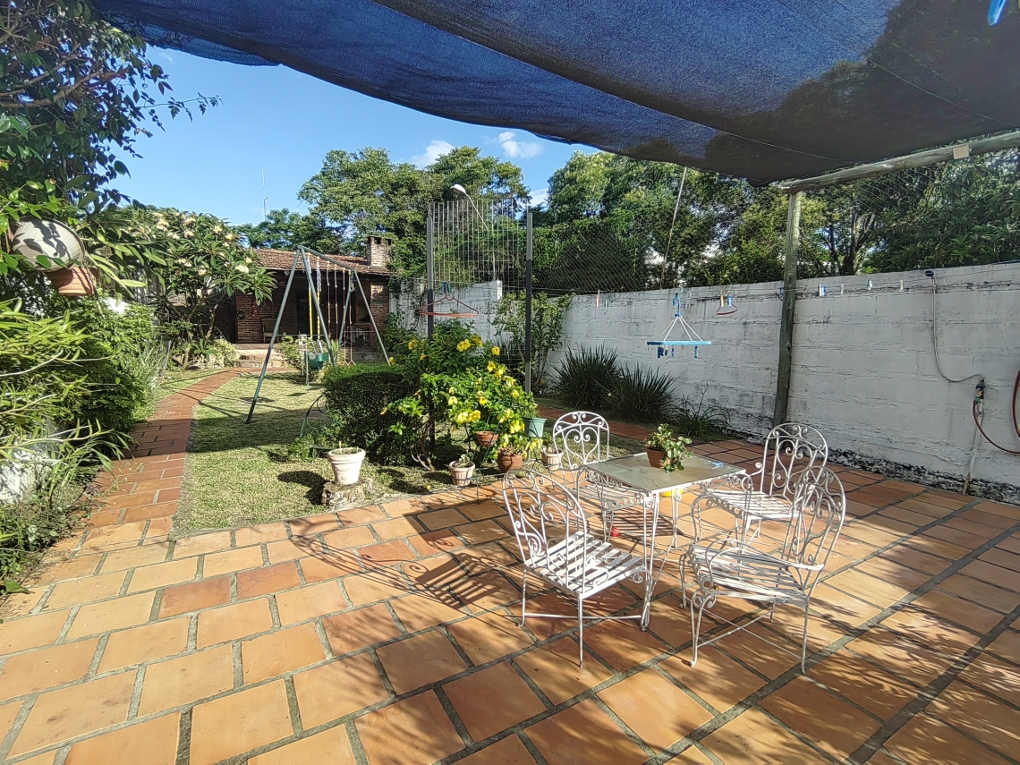 El exterior de la residencia no se queda atrás, con un extenso jardín que brinda un entorno sereno y relajante. En la parte posterior, encontrarás una barbacoa techada, un depósito y un baño social, todo pensado para satisfacer tus necesidades y deseos de entretenimiento.