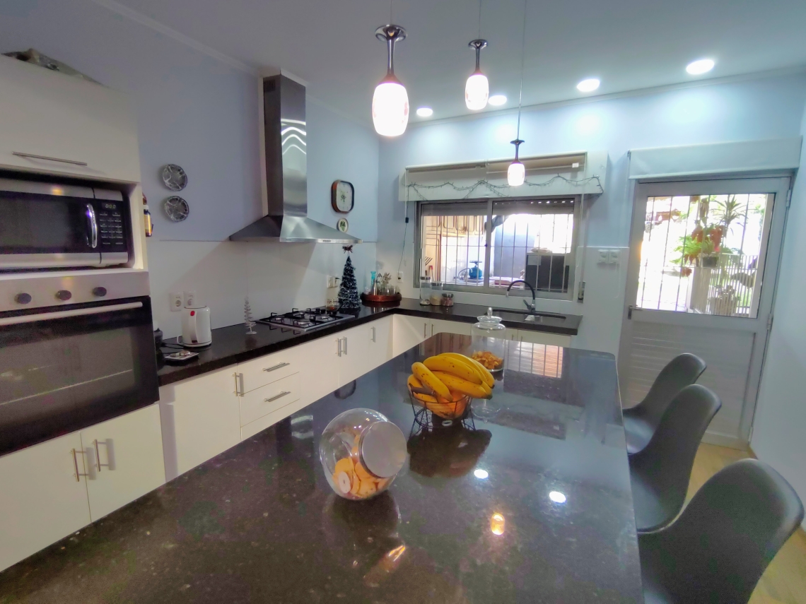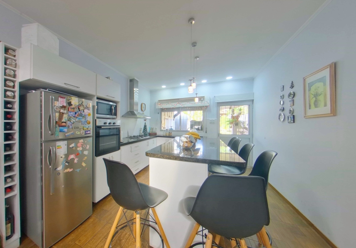 La cocina, concebida con un diseño moderno, presenta una distribución espaciosa, una isla generosa y prácticos placares aéreos y bajo mesada que ofrecen amplio espacio de almacenamiento. Además, la propiedad cuenta con una zona de lavadero para mayor conveniencia.