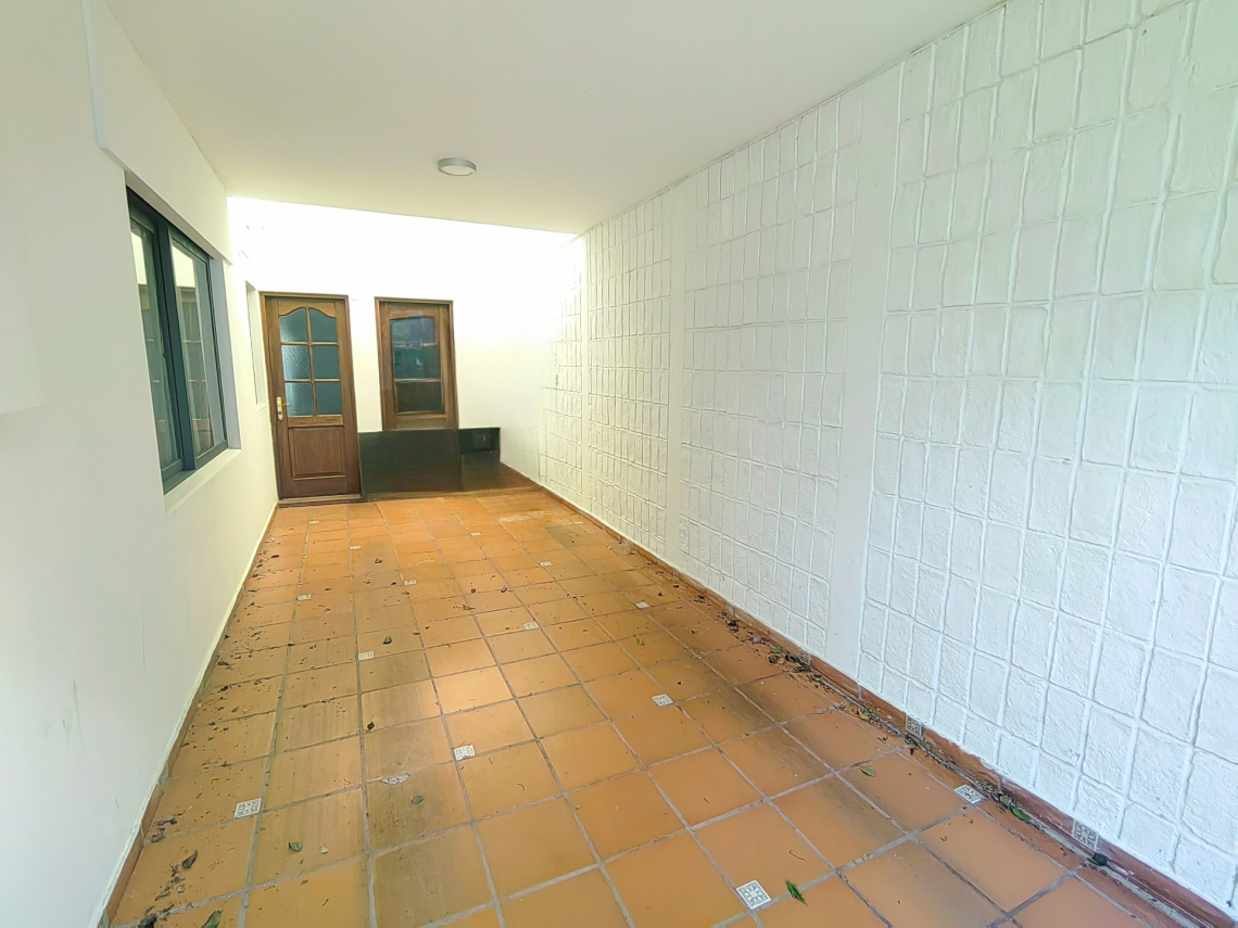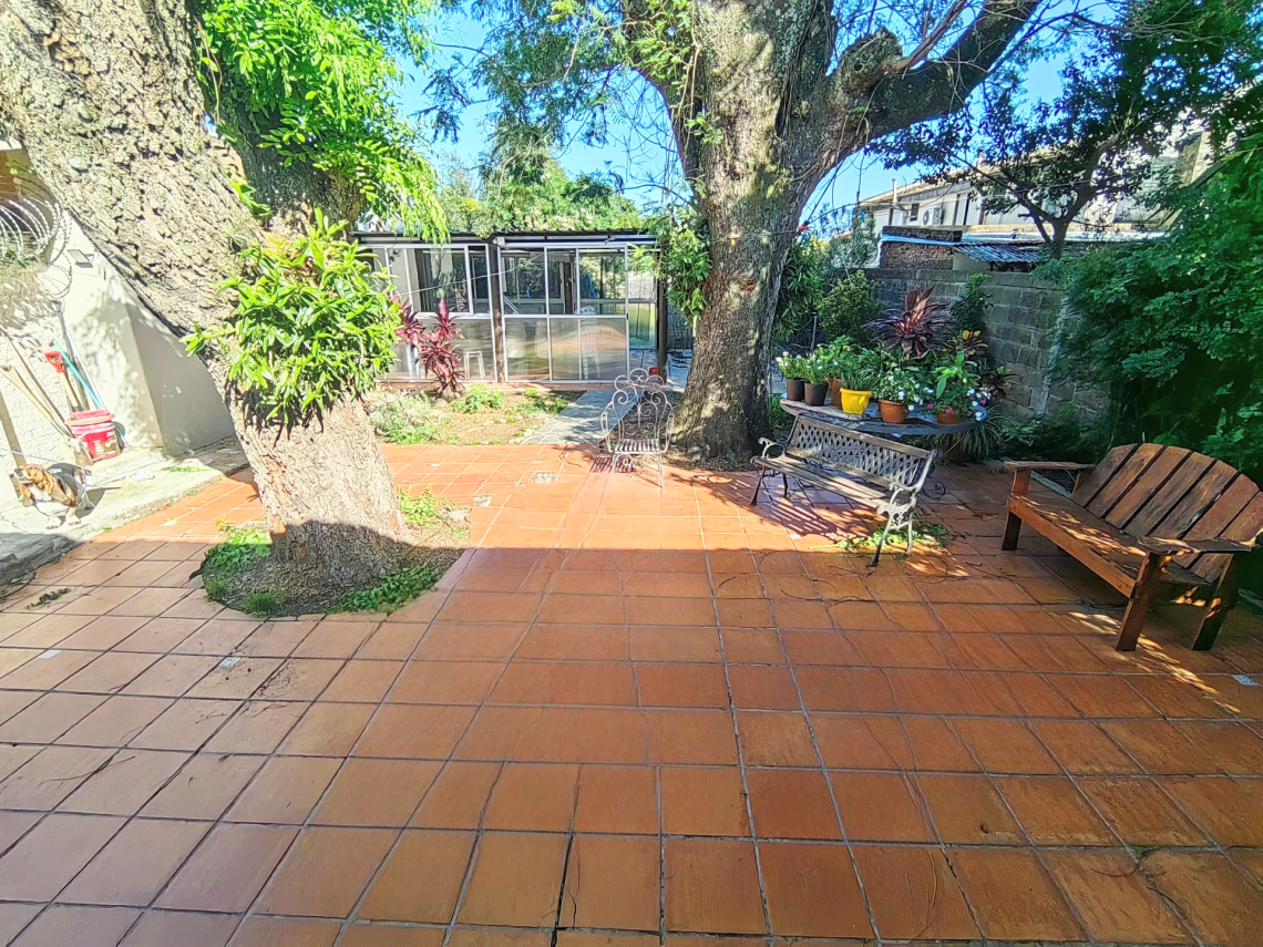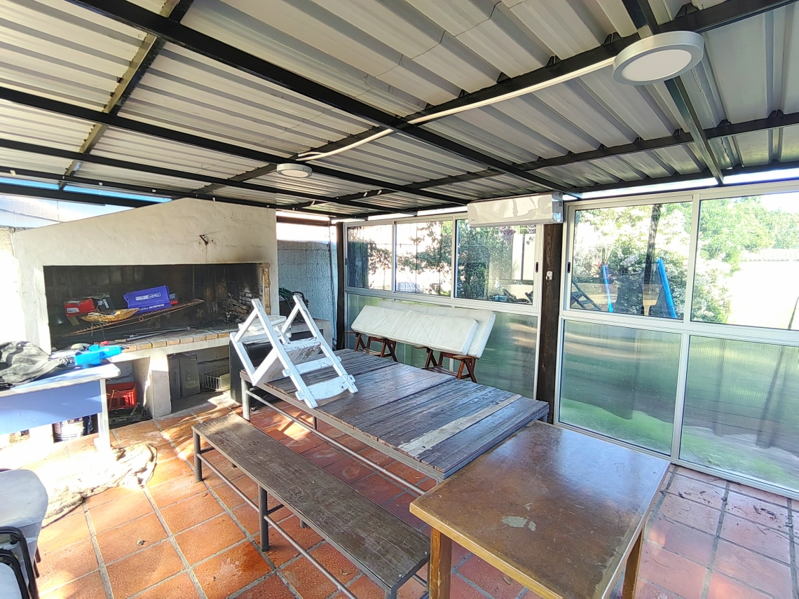 El patio de la casa incluye una churrasquera techada, perfecta para reuniones y parrilladas, así como un galpón en el fondo, que brinda espacio adicional para almacenamiento u otras actividades. El jardín al frente le agrega un encanto especial a la propiedad, mientras que el garaje tiene capacidad para un vehículo grande y también hay una cochera disponible para otro vehículo.