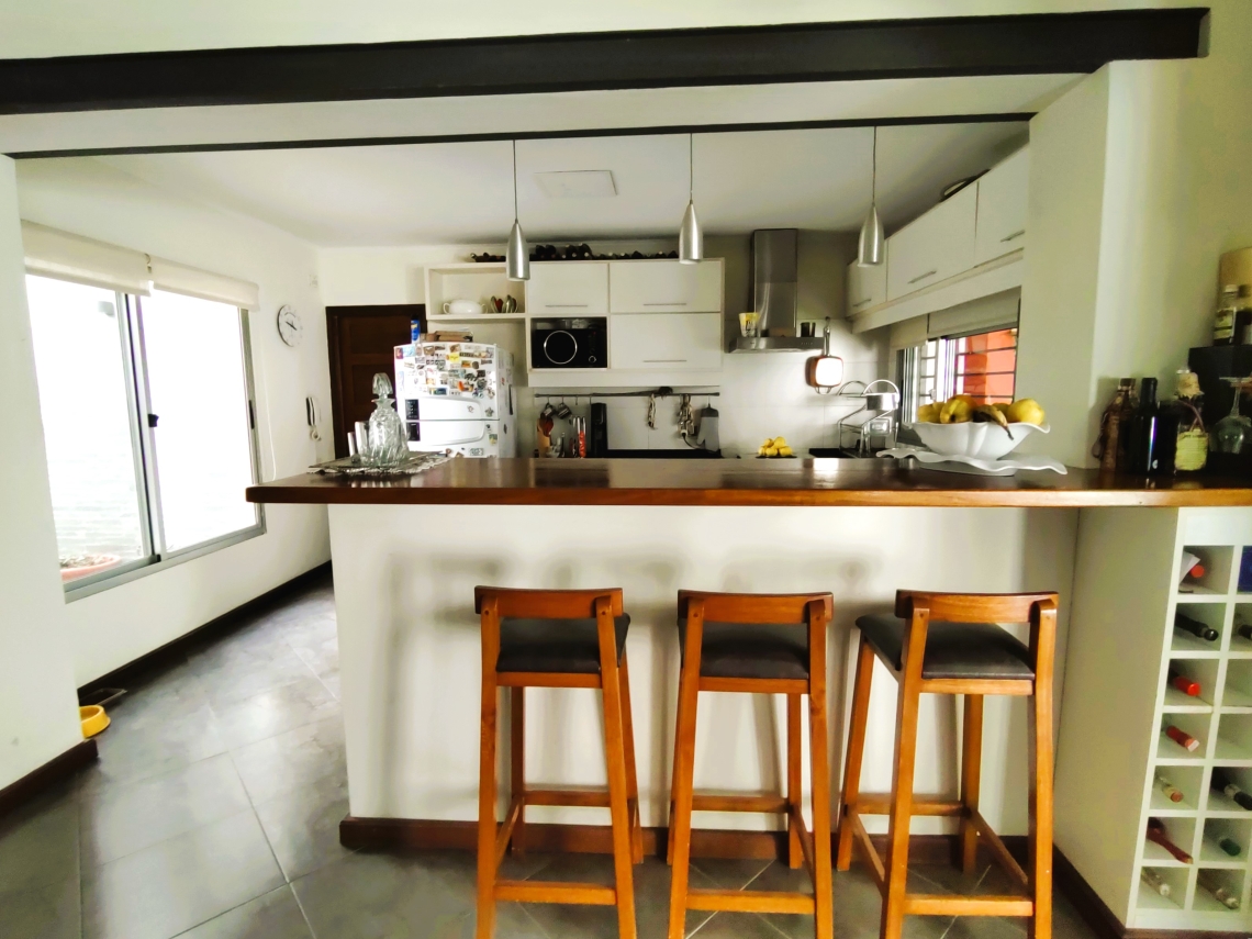 - Cocina con barra americana, placares aéreos y bajo mesada