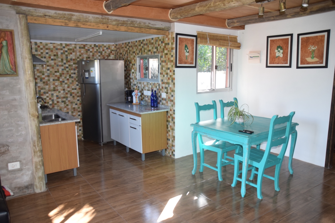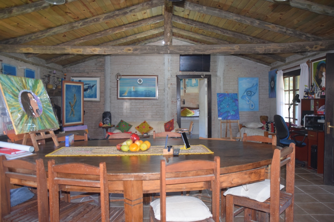 La propiedad ofrece dos estructuras principales: una sofisticada residencia principal con un diseño de concepto abierto que integra de manera armoniosa la sala de estar, el comedor y la cocina. Además, cuenta con un dormitorio principal completo con baño privado, y un baño adicional para visitantes. Un amplio alero se extiende a lo largo del frente de la casa, equipado con un área de parrilla techada y espacio para dos vehículos en la cochera. También incluye un galpón de generosas dimensiones.
