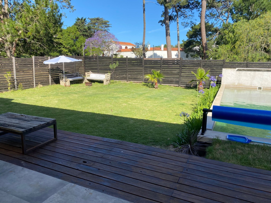 El deck con parrillero es perfecto para organizar reuniones y disfrutar de asados al aire libre. El extenso jardín, rodeado de césped y plantas, proporciona un entorno natural y relajante que completa esta maravillosa propiedad.
